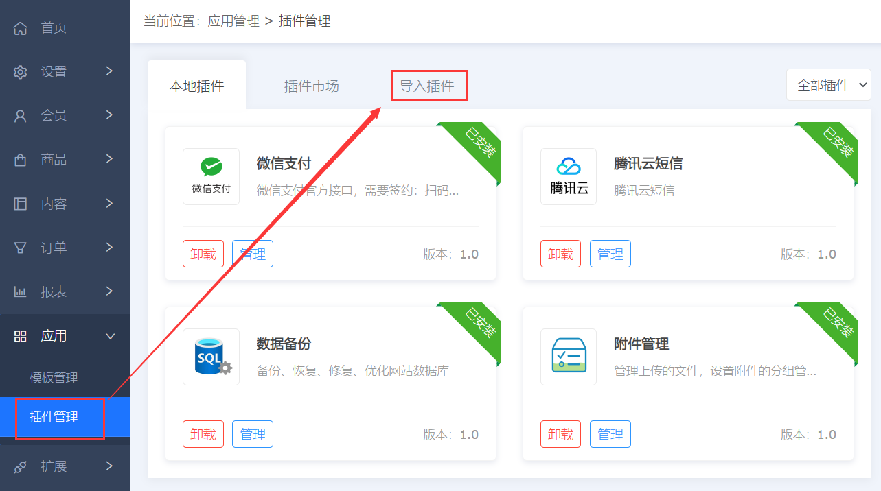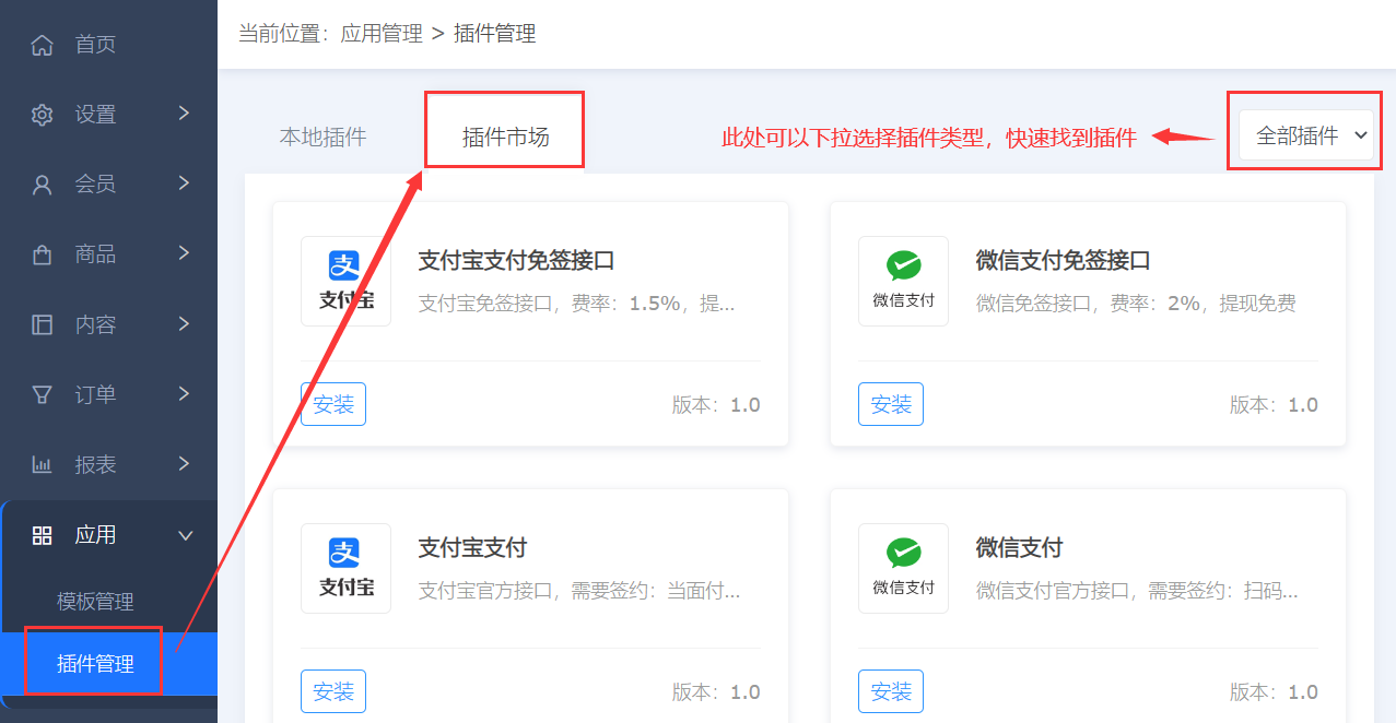 1、首先登录您网站的后台,进入插件市场页面,如下图: