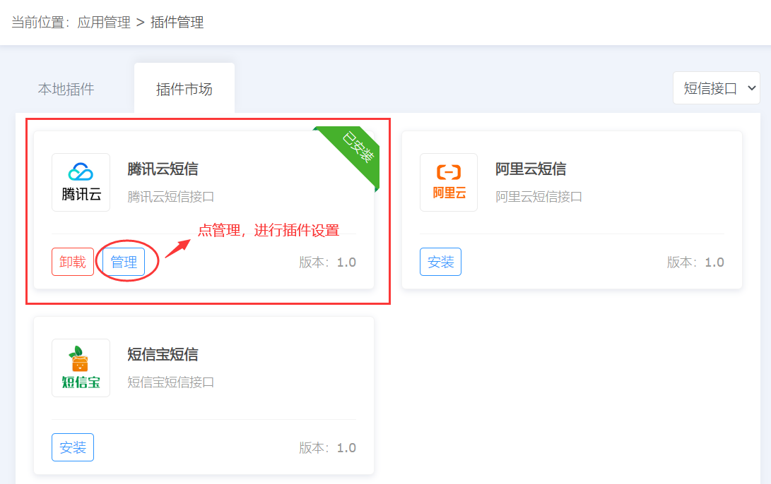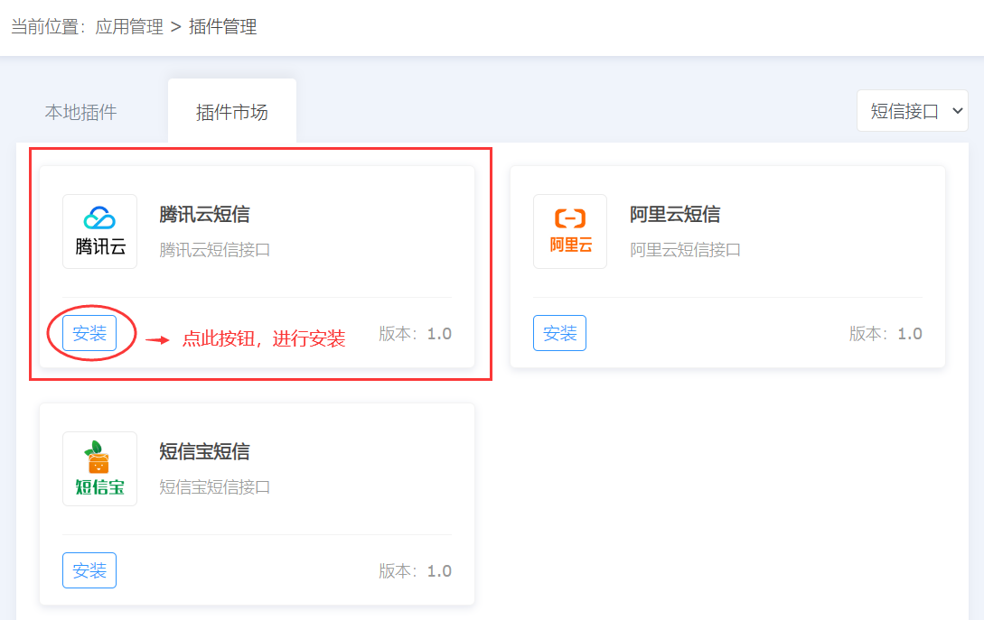 2、找到您要的插件,进行安装即可,我们以【腾讯云短信】为例,如下图: