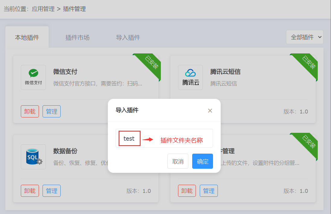 3、找到【导入插件】链接,点击弹出对话框,如下图: