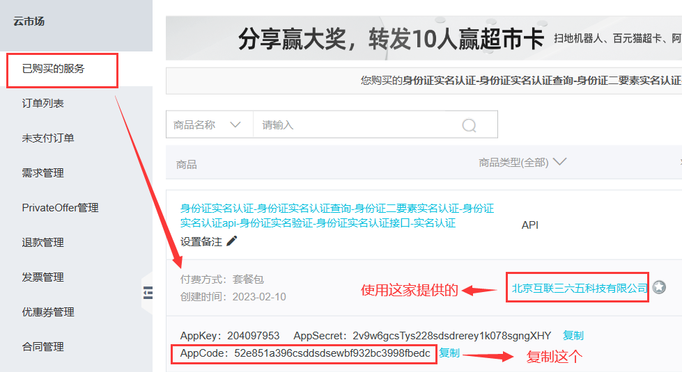 申请成功后,进入阿里云的云市场管理控制台:https://market.console.aliyun.com,可以看到我们申请的接口信息,如下图: