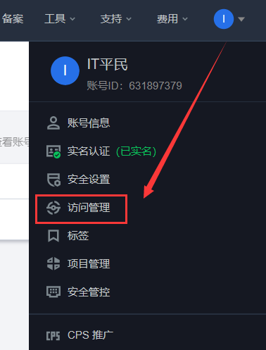 在腾讯云官网右上角头像下拉菜单中,找到【访问管理】,如下图: