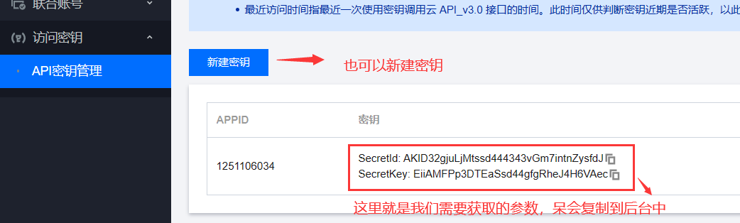 上图中的【SecretId】和【SecretKey】就是我们上一步中【API密钥管理】中获取的【SecretId/SecretKey】参数,分别粘贴填写进去即可。