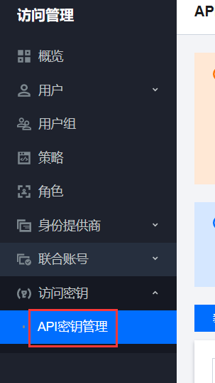 点击【访问管理】进入相关页面,然后在打开的页面左侧找到【API密钥管理】,如下图: